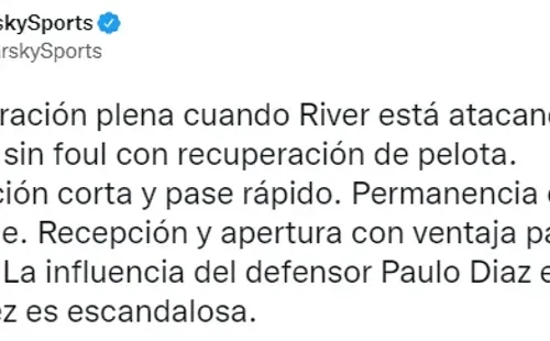 Si bien varias ópticas indicaron que la falta pudo ser señalada, hay análisis que difieren, y uno de ellos es el del periodista Juan Pablo Varsky, quien tuvo solo palabras de elogios para el zaguero de la Roja a las órdenes de Marcelo Gallardo. “La influencia del defensor Paulo Diaz en el 1-0 de Suárez es escandalosa”, sentenció.