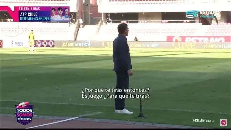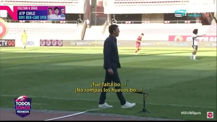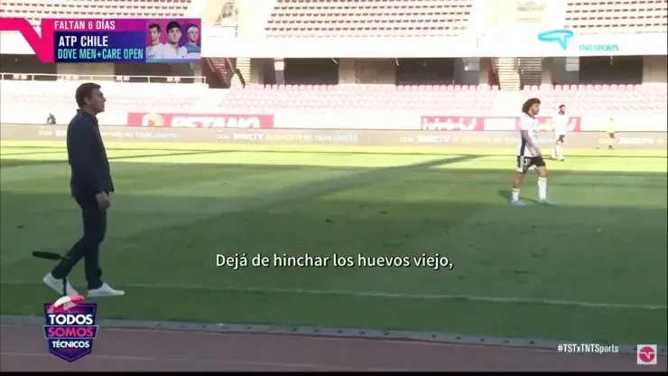 La secuencia de la cámara de TNT Sports evidencia la molestia del técnico de Colo Colo, Gustavo Quinteros, con el defensor Maximiliano Falcón