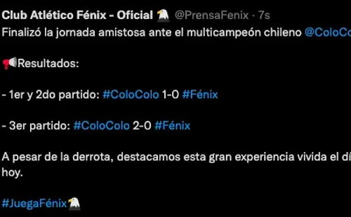 11:38FINALIZADO: Colo Colo se impone en los duelos amistosos ante Fénix del Pilar en Buenos Aires y en la segunda ronda de 30 minutos se impuso 2-0. Con un marcador global de 4-0, finalmente Colo Colosaca cuentas positivas en su primer desafío dentro de la exigente pretemporada en Argentina.
