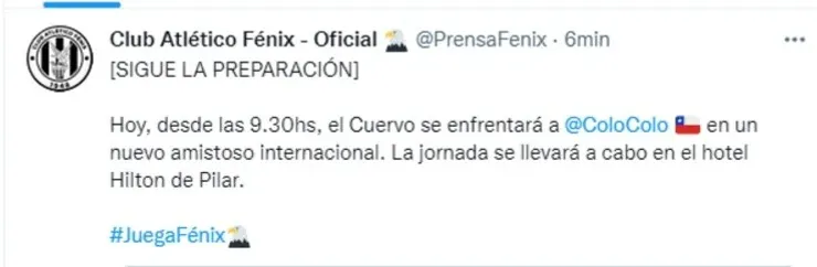 8:50 ATENCIÓN ALBOS:Se RETRASA el amistoso. Fénix de Pilar informa que el apronte de pretemporada con Colo Colo se iniciará a las 9:30 horas, media hora más tarde que lo advertido inicialmente,