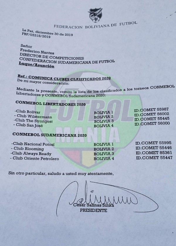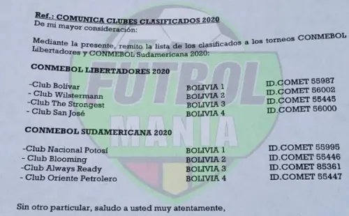 Pero la Federación Boliviana cortó por lo sano y presentó ante la Conmebol a todos sus equipos para las competiciones internacionales: Club Bolivar (Bolivia 1), Jorge Wilstermann (Bolivia 2), The Strongest (Bolivia 3) y Club San José (Bolivia 4).