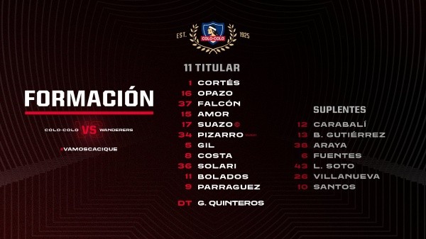 Al delantero se suma la base que ha mantenido Colo Colo a lo largo de la temporada, con su línea de cuatro en el fondo ya definida y su delantera solo con la inclusión del ex Caturro. En el mediocampo está la otra novedad, con Vicente Pizarro tomando el puesto de César Fuentes.