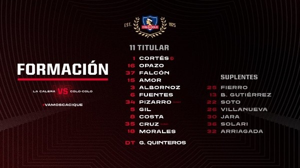 Colo Colo: Brayan Cortés; Óscar Opazo, Maximiliano Falcón, Emiliano Amor, Miiko Albornoz; Vicente Pizarro, César Fuentes, Leonardo Gil; Gabriel Costa, Iván Morales y Joan Cruz.