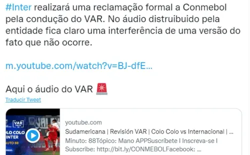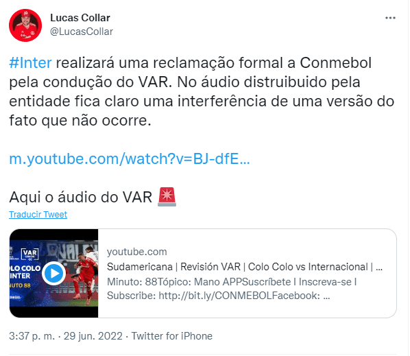 De hecho, el reportero Lucas Collar afirmó que habrá un reclamo al ente del máximo ente del fútbol sudamericano. “Internacionalhará una denuncia formal a la CONMEBOL por la conducta del VAR. En el audio difundido por la entidad se evidencia una interferencia de una versión del hecho que no ocurre”, indicó.