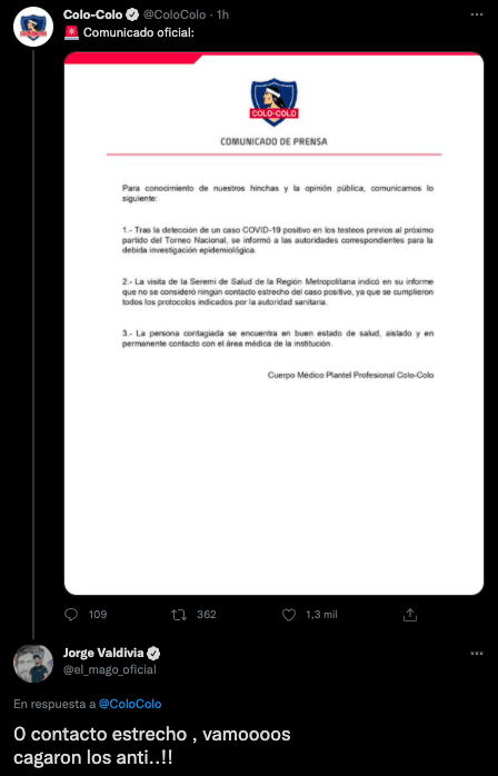 Valdivia no se hizo problemas y celebró que Colo Colo no pierda jugadores. “¡Cerocontactos estrechos, vamos!“, lanzó para luego disparar contra los críticos de los Albos. “¡Cagaron los anti!“, recalcó.