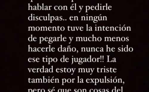 El jugador cementero usó las redes sociales para disculparse con sus colegas y con la afición por la acción que le costó la tarjeta roja. “Quería pedir disculpas por lo de hoy por sobre todo a mis compañeros gente del club y obviamente a César, que tuve la posibilidad de hablar con él”, afirmó en sus historias de Instagram.