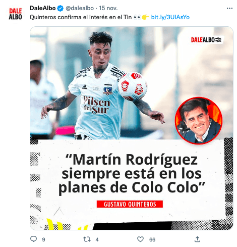 Pero ojo que no sólo en la cancha hay movimiento en Macul, ya que la dirigencia trabaja a toda máquina para de cumplir los deseos de Gustavo Quinteros, para que decida ampliar su contrato a fin de año. En ese contexto, los Albos hicieron oficial la contratación de Fernando de Paul, pero no fue el ex Universidad de Chile el que llamó la atención de los hinchas sino un viejo conocido que pretenden, otra vez, repatriar: Martín Rodríguez.