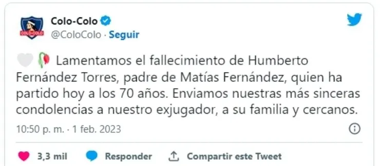 Así lo comunicó oficialmente Colo Colo, alma mater de Matigol, en sus redes sociales. “Lamentamos el fallecimiento de Humberto Fernández Torres, padre de Matías Fernández, quien ha partido hoy a los 70 años. Enviamos nuestras más sinceras condolencias a nuestro exjugador, a su familia y cercanos”.