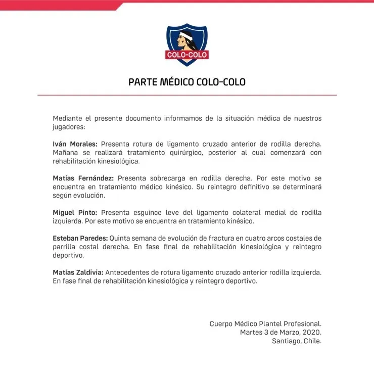 El mediocampista del Cacique arrojó una sobrecarga en la rodilla derecha, según explicó el club en un comunicado. “Por este motivo se encuentra en tratamiento médico kinésico. Su reintegro definitivo se determinará según evolución”, agregó el informe del cuerpo médico colocolino.