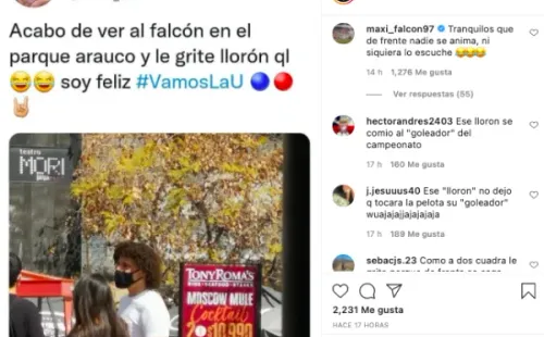 El usuario @jxanito_albo publicó un mensaje de Twitter de otro identificado como @Manu_Lais. En él, el fanático de la U aseguraba que “acabo de ver a Maxi Falcón en el Parque Arauco y le grité “Llorón”. Soy feliz“. Pero lo que nadie se esperaba era que el propio peluca se haría presente.