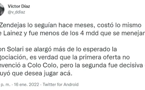 El reportero se extendió con su explicación y cuenta que el argentino fue clave para que las cosas fluyeran en favor de los mexicanos.”Es verdad que la primera oferta no convenció a Colo Colo, pero la segunda fue decisiva e influyó que desea jugar acá”, siguió a través de la mencionada red social.