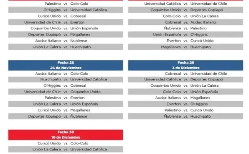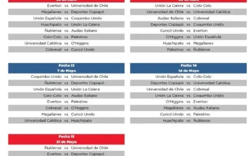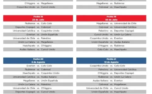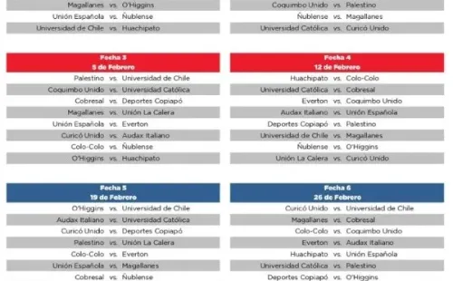 El Superclásico, por ejemplo, ya tiene fecha. El 12 de marzo, Colo Colo será anfitrión de Universidad de Chile en el estadio Monumental, mientras que la revancha esperará hasta el 3 de septiembre, con localía para el conjunto azul.