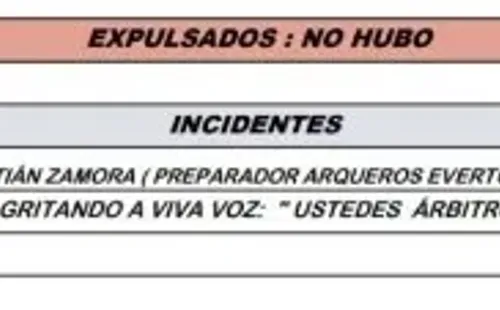 Maza indicó que “es expulsado del área técnica el señor Cristián Zamora (preparador arqueros Everton) por emplear lenguaje grosero y ofensivo en contra del equipo arbitral, gritando a viva voz: “Ustedes huevones siempre cobrando todo a favor de las zorras culias”.