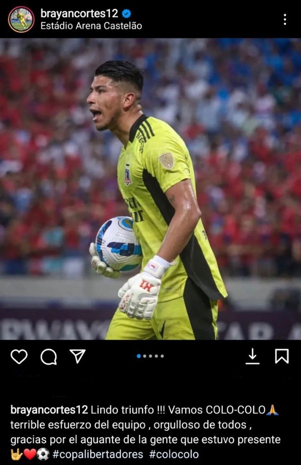 “¡Lindo triunfo! Vamos Colo Colo. Terrible esfuerzo del equipo. Orgulloso de todos, gracias por el aguante a la gente que estuvo presente”, sostuvo el arquero Brayan Cortés tras el duelo en redes sociales.