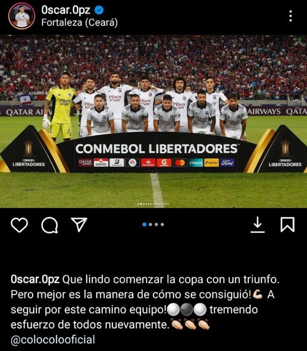 Óscar Opazo también festejó en Instagram: “qué lindo comenzar la Copa con un triunfo. Pero mejor es la manera de cómo se consiguió. ¡A seguir por este camino equipo! Tremendo esfuerzo de todos nuevamente”, manifestó el Torta.