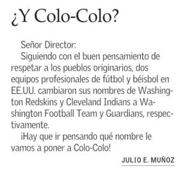 Así fue que lo escribió el lector Julio Muñoz en una carta titulada “¿Y Colo Colo?”. “Señor Director. Siguiendo con el buen pensamiento de respetar a los pueblos originarios, dos equipos profesionales de fútbol y béisbol en EEUU cambiaron sus nombres de Washington Redskins y Cleveland Indians a Washington Football Team y Guardians, respectivamente. ¡Hay que ir pensando qué nombre le ponemos a Colo Colo!”.