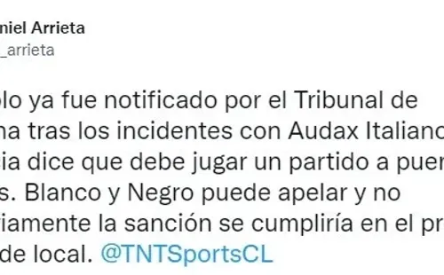 “Colo Colo ya fue notificado por el Tribunal de Disciplina tras los incidentes con Audax Italiano. La sentencia dice que debe jugar un partido a puertas cerradas”, comentó el periodista.