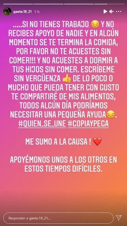 “Si no tienes trabajo, no recibes la ayuda de nadie y en algún momento te quedas sin comida, por favor no te acuestes sin comer. No acuestes sin comer a tus hijos”, escribió el albo.