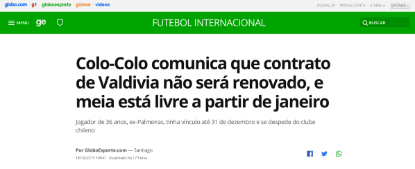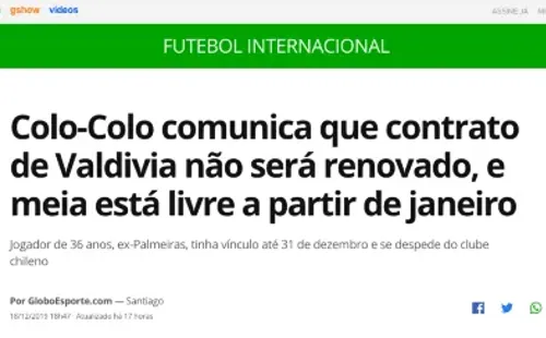 Por otro lado, Globo Esporte también tuvo palabras para la salida de Valdivia del cacique. “El ex jugador de Palmeiras, de 36 años, tenía un contrato hasta el 31 de diciembre y se despide del club chileno“, adelantan.
