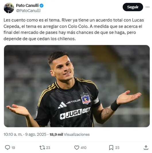 “Les cuento como es el tema”, agregó este sábado. “River ya tiene un acuerdo total con Lucas Cepeda, el tema es arreglar con Colo Colo. A medida que se acerca el final del mercado de pases hay más chances de que se haga, pero depende de que cedan los chilenos”, complementó.