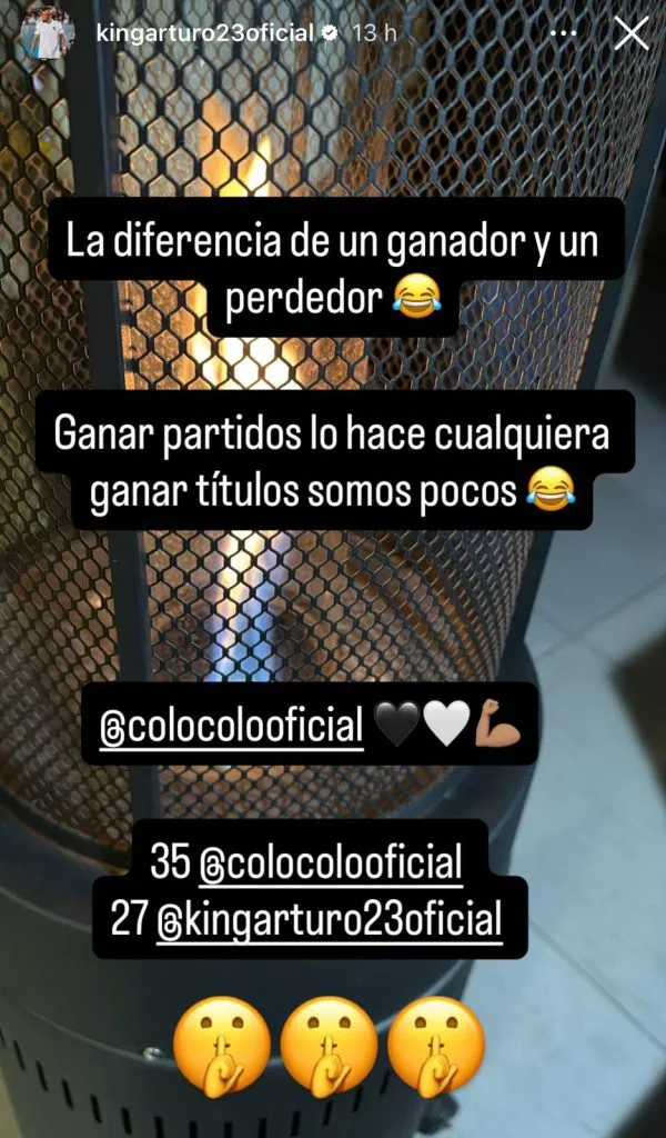 “35 Colo Colo y 27 Arturo Vidal”, remató poniendo, además, emoticones de silencio para los hinchas azules que celebraban su gran victoria en el Superclásico.