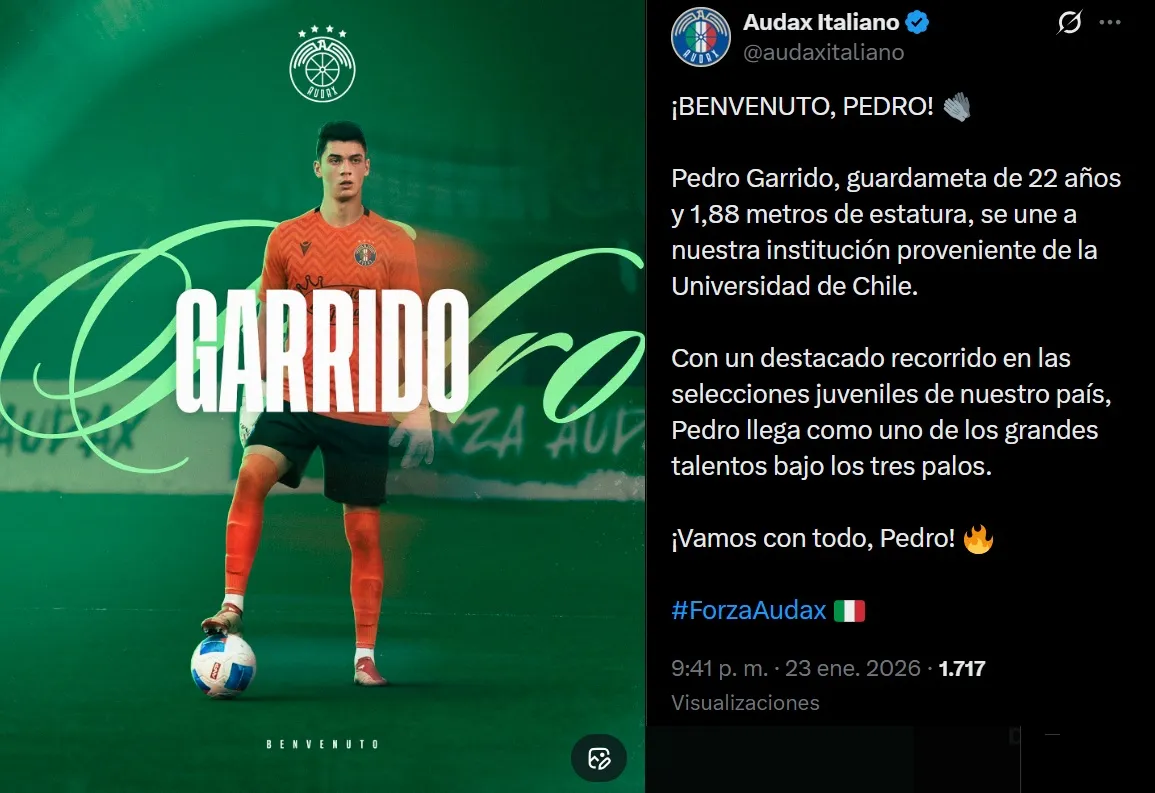 A través de sus redes, el cuadro itálico le dio la bienvenida a Pedro Garrido, portero de 22 años y de 1,88 metros de altura. “Con un destacado recorrido en las selecciones juveniles de nuestro país, Pedro llega como uno de los grandes talentos bajo los tres palos. ¡Vamos con todo, Pedro!”.