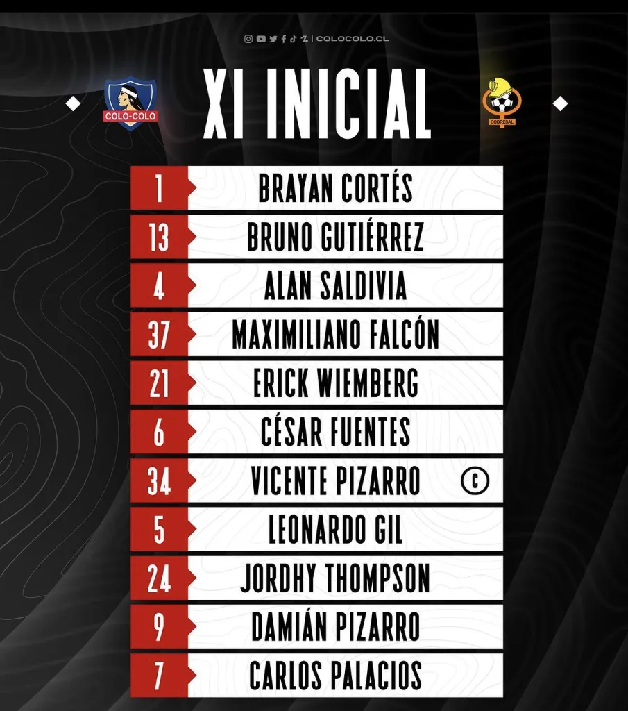 Con esto, la formación de Colo Colo será con Brayan Cortés; Bruno Gutiérrez, Alan Saldivia, Maximiliano Falcón, Erick Wiemberg; César Fuentes, Vicente Pizarro, Leonardo Gil; Jordhy Thompson, Damián Pizarro y Carlos Palacios.