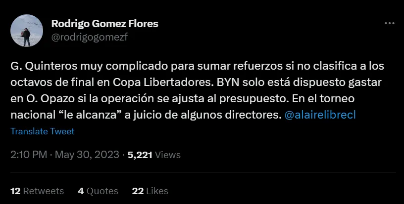 Según informó Al Aire Libre en Cooperativa, Colo Colo debe acceder a los octavos de final de la Copa Libertadores para que la dirigencia abra la billetera y utilice las tres incorporaciones disponibles de la ventana de traspasos que se avecina. En caso de que eso no ocurra, es muy probable que Quinteros deba continuar con la plantilla actual. Aunque con un premio de consuelo.