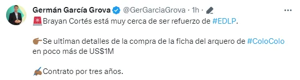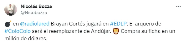 Nicolás Bozza, también de Radio La Red, consignó que “Brayan Cortés jugará en EDLP. El arquero de Colo Colo será el reemplazante de Andújar. El León compra su ficha en un millón de dólares”.
