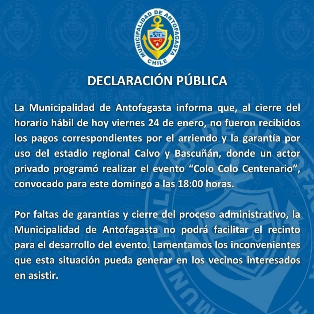 “Al cierre del horario hábil de hoy viernes 24 de enero, no fueron recibidos los pagos correspondientes por el arriendo y la garantía por uso del estadio regional Calvo y Bascuñan, donde un actor privado programó realizar el evento ‘Colo Colo Centenario’, convocado para este domingo a las 18:00 horas”, explicaba el documento.