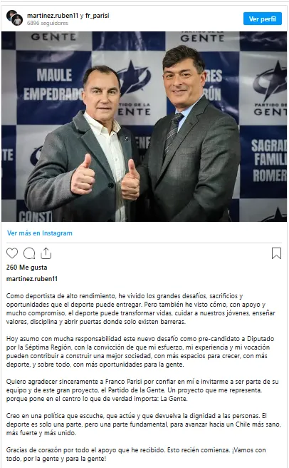“Hoy asumo con mucha responsabilidad este nuevo desafío como pre-candidato a Diputado por la Séptima Región, con la convicción de que mi esfuerzo, mi experiencia y mi vocación pueden contribuir a construir una mejor sociedad, con más espacios para crecer, con más deporte, y sobre todo, con más oportunidades para la gente”, dijo el trigoleador en su cuenta de Instagram.