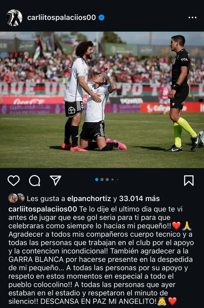 Fue en sus redes sociales donde Carlos Palacios decidió escribir un mensaje al pequeño, de manera de hacer una despedida pública y dedicarle el gol del triunfo de Colo Colo.