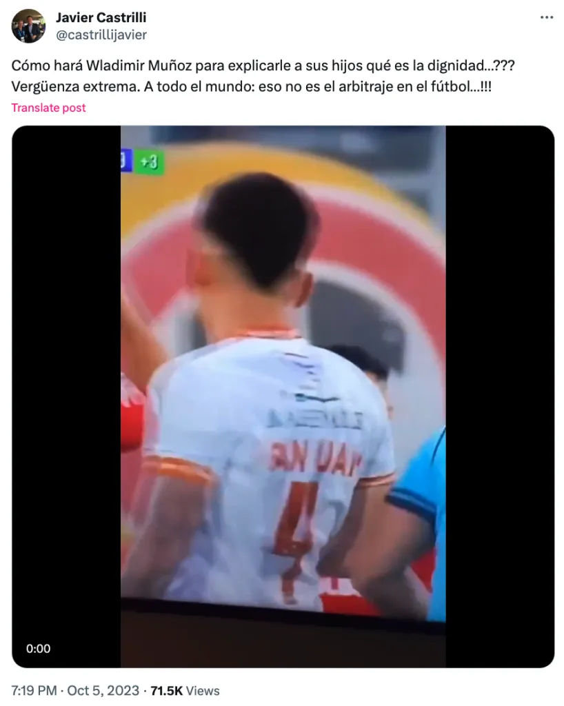 “¿Cómo hará Wladimir Muñoz para explicarle a sus hijos qué es la dignidad? Vergüenza extrema. A todo el mundo: eso no es el arbitraje en el fútbol”, comentó en su cuenta de Twitter.