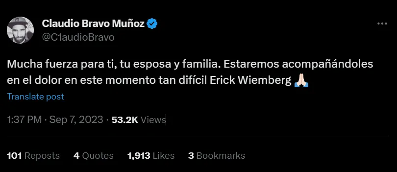 “Mucha fuerza para ti, tu esposa y familia”, dice la primera parte del mensaje de Claudio Bravo para la familia Wiemberg Eggers. Eso no fue todo por parte del ex guardavalla del Barcelona y el Manchester City.