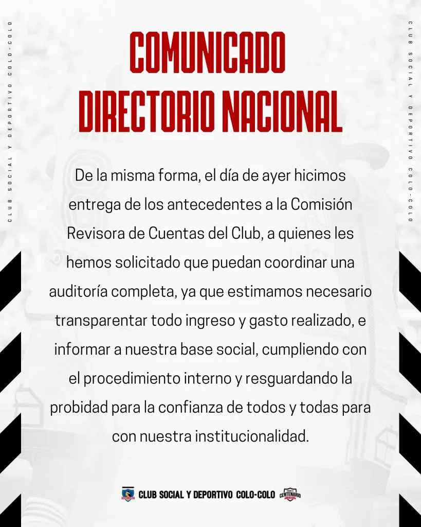 En esa línea, el Club Social y Deportivo Colo Colo añade que “hicimos entrega de los antecedentes a la Comisión Revisora de Cuentas del club, a quienes les hemos solicitado que puedan coordinar una auditoría completa, pues estimamos necesario transparentar todo ingreso y gasto realizado”.