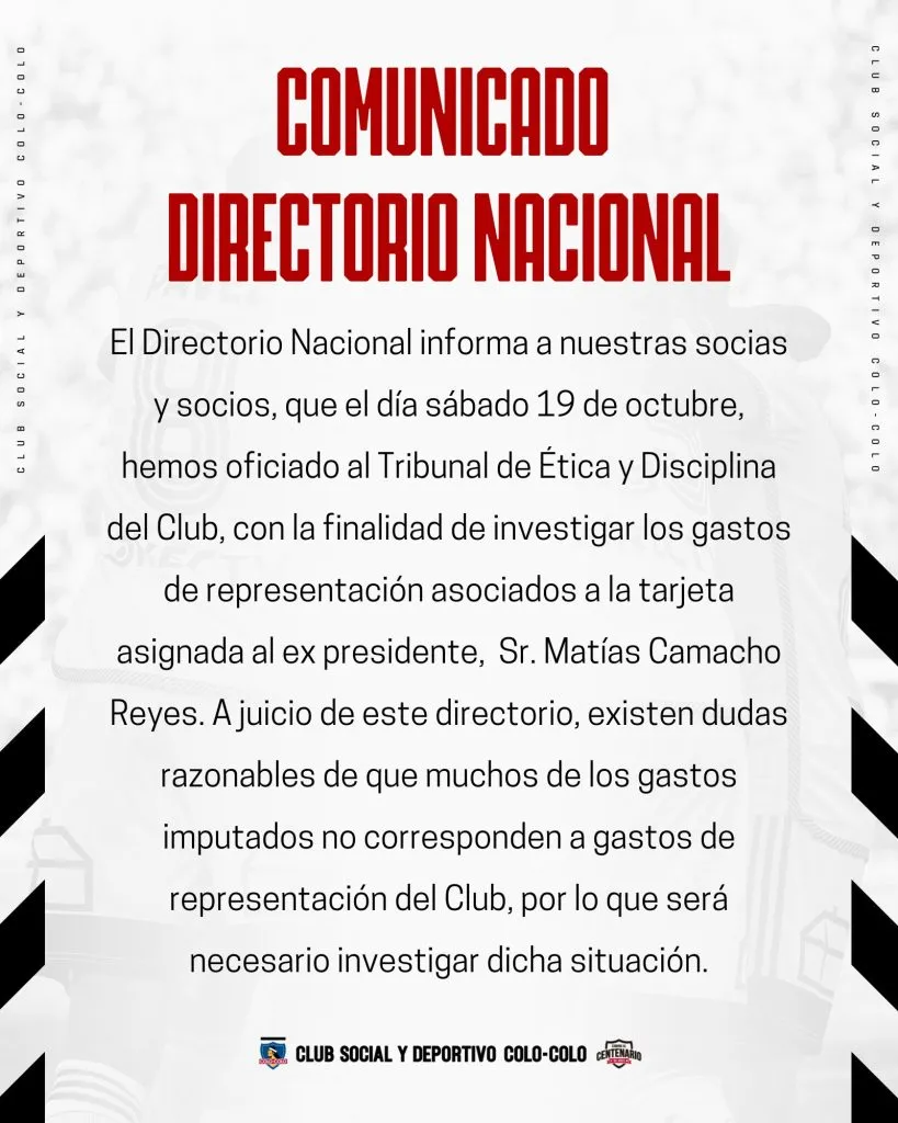 A través de un comunicado oficial, el CSD Colo Colo informó que se abrirá una investigación en contra de Camacho, la cual encabezará el Tribunal de Ética y Disciplina del club, pues acusan “dudas razonables” en gastos que realizó con instrumentos bancarios del organismo.