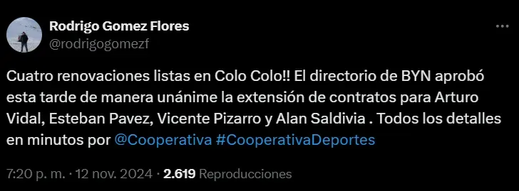 Lo mismo aseguró Aníbal Mosa, el presidente de Blanco y Negro. “El directorio aprobó esta tarde de manera unánime la renovación de Arturo Vidal”, reportó Rodrigo Gómez, periodista de Cooperativa Deportes. El citado comunicador informó a través de su cuenta de Twitter este avance.