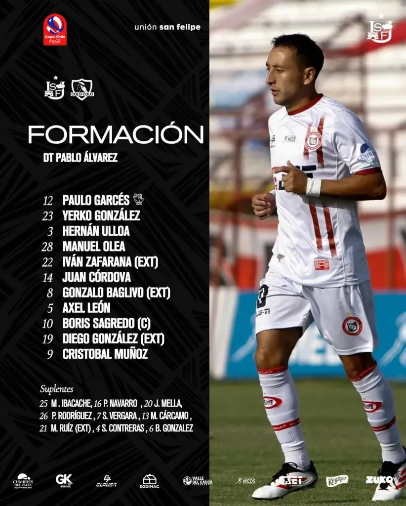 En tanto, esta será la formación de Unión San Felipe con Paulo Garcés en el pórtico, Yerko González, Hernán Ulloa, Manuel Olea e Iván Zafarana en defensa; Juan Córdova, Gonzalo Baglivo, Axel León y Boris Sagredo; Diego González y Cristóbal Muñoz en delantera.