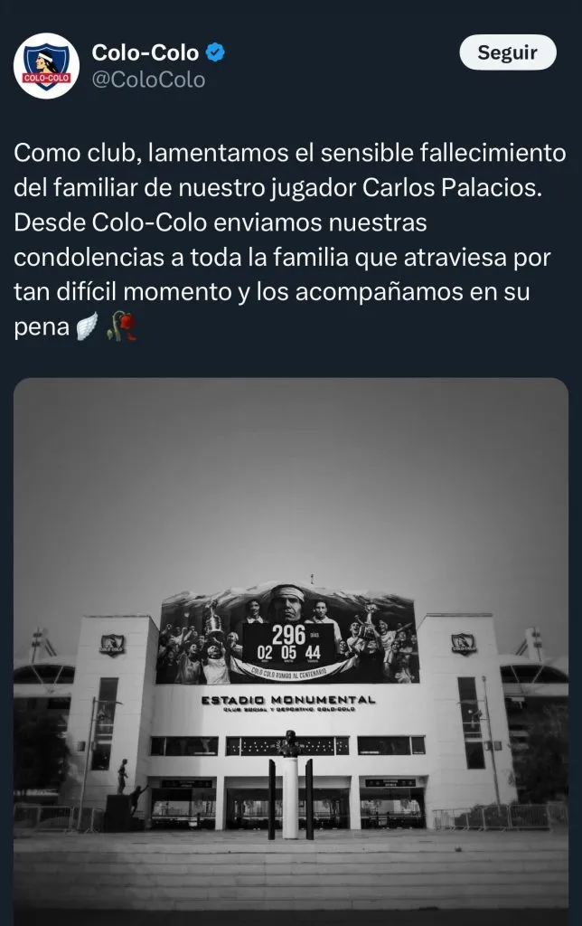 “Como club, lamentamos el sensible fallecimiento del familiar de nuestro jugador Carlos Palacios. Desde Colo-Colo enviamos nuestras condolencias a toda la familia que atraviesa por tan difícil momento y los acompañamos en su pena”, explicaron.