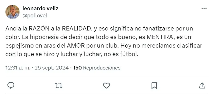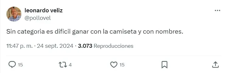 Uno de los que lideró el ataque en redes sociales contra el Cacique fue el ex jugador albo y de la Selección Chilena, Leonardo Véliz, quien utilizó su cuenta en X para lanzar sus dardos hacia el equipo, asegurando que “sin categoría es difícil ganar con la camiseta y con nombres“.