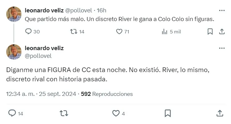 No fue lo único. El Pollo prosiguió en su análisis y escribió “díganme una figura de Colo Colo esta noche. No existió. River, lo mismo. Discreto rival con historia pasada (…) Qué partido más malo. Un discreto River le gana a Colo Colo sin figuras“.