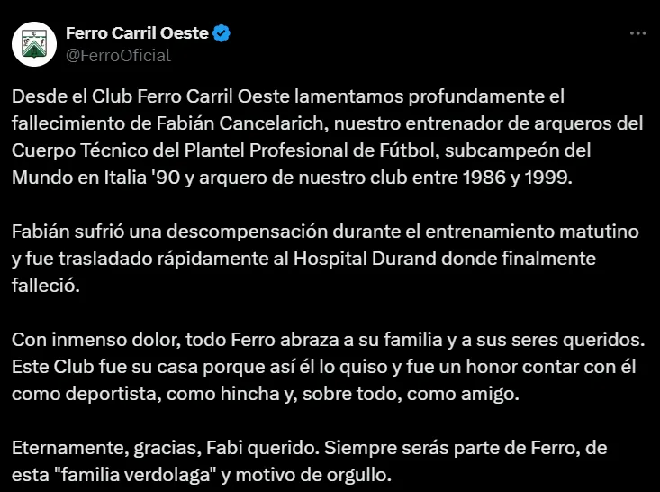 “Este club fue su casa porque así él lo quiso. Fue un honor contar con él como deportista, como hincha y, sobre todo, como amigo”, manifestó también el cuadro verde sobre Cancelarich, quien también tuvo alguna competencia en la selección de Argentina juvenil con el Superman Vargas.