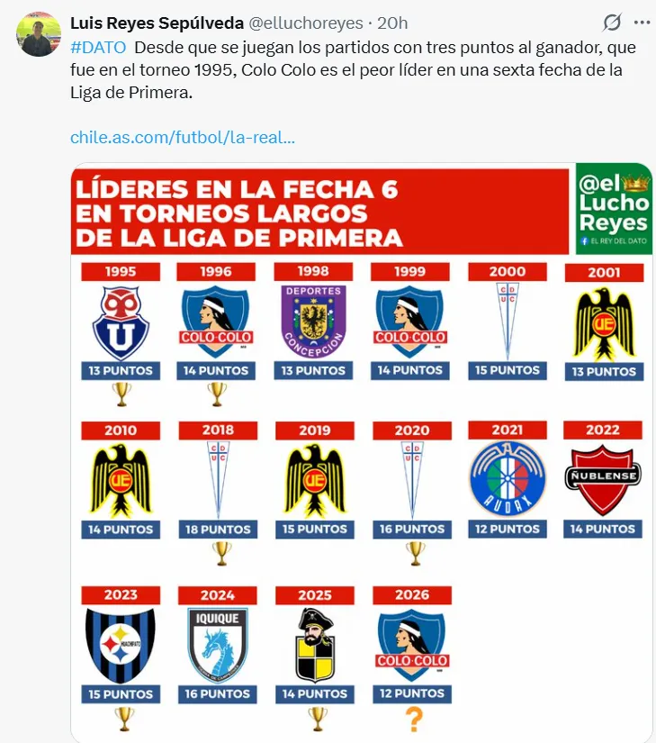 Simplemente, Colo Colo es el peor líder de todos los tiempos. Con doce puntos, el Cacique se transformó en el peor primer lugar de la historia del campeonato chileno, desde que las victorias valen tres unidades, es decir desde 1995.
