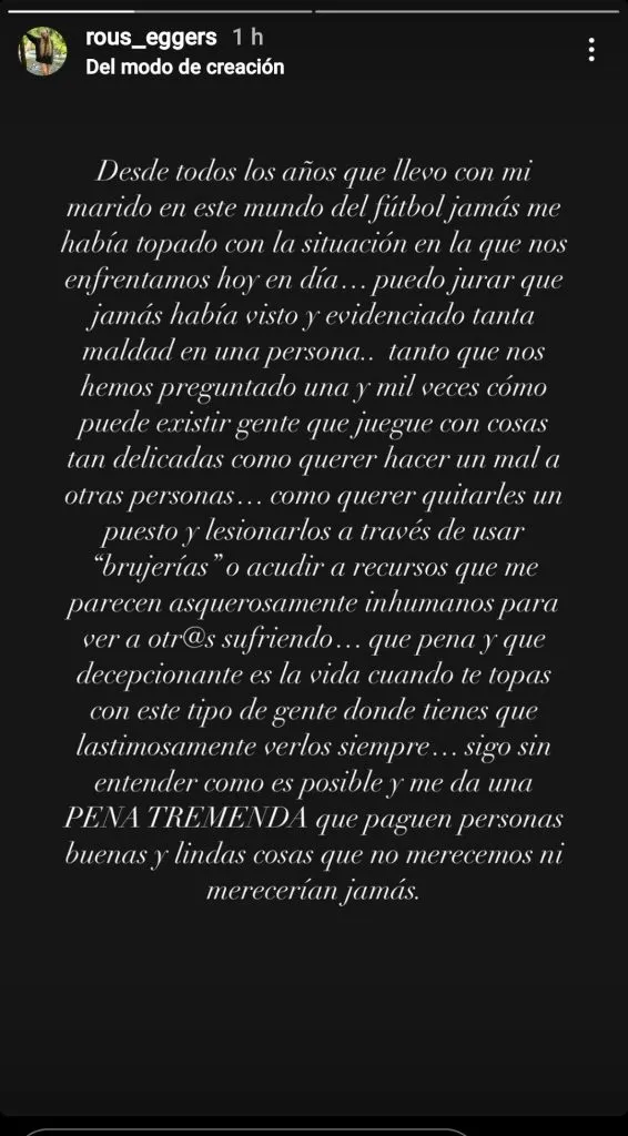 Sin dar nombres, Eggers asegura que a su esposo “quisieron quitarle el puesto y lesionarlo a través de usar ‘brujerías’ o acudir a recursos que me parecen asquerosamente inhumanos para ver a otros sufriendo (…) Sigo sin entender cómo es posible y me da una pena tremenda que paguen personas buenas”.