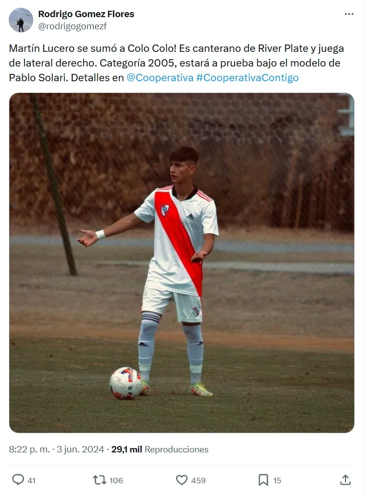 La curiosidad es que el nombre de este jugador, categoría 2005, es Martín Lucero… Sí, mismo nombre y apellido del ex goleador de Colo Colo, con la diferencia que este futbolista es lateral derecho y proviene desde River Plate.