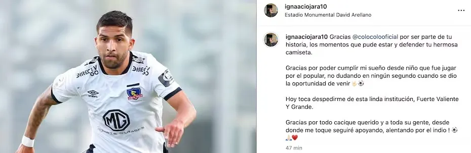 El formado en Cobreloa escribió en su Instagram “gracias Colo Colo por ser parte de tu historia, los momentos que pude estar y defender tu hermosa camiseta. Gracias por poder cumplir mi sueño desde niño que fue jugar por el popular, no dudando en ningún segundo cuando se dio la oportunidad de venir”.