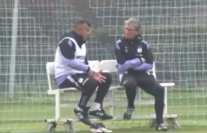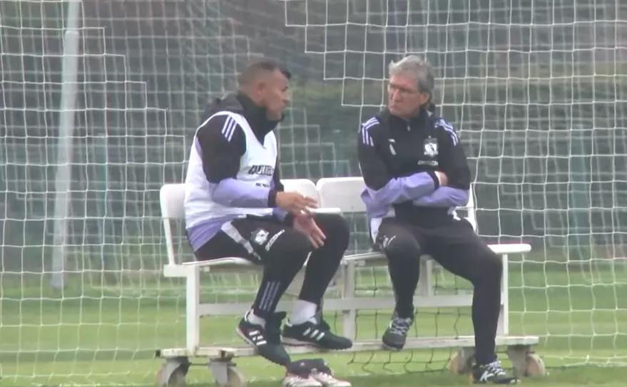 De acuerdo a lo que captó una de las cámaras de Canal 13, el entrenador argentino tuvo una extensa charla con el gerente deportivo de Blanco y Negro, quien es uno de los pocos al interior del club que defiende su ciclo y rechaza su despido.