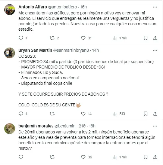 Además Matías Camacho, actual presidente del CSD Colo Colo, tomó el guante al respecto. El dirigente publicó en Twitter que “esto demuestra la poca conexión con los hinchas de Colo-Colo. Como CSD apelaremos para que los beneficios del abono se extiendan a copas internacionales, como ha sido en años anteriores. Lamentamos las cortapisas de un sector de ByN hacia cualquier beneficio para los socios”.