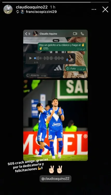 Tras esta anotación, el jugador de Vélez compartió una conversación previa que tuvo con Claudio Aquino, a quien antes del partido le avisó que le dedicaría un hipotético gol a su clásico rival. Cabe recordar que el actual volante de Colo Colo jugó por cuatro años en Cerro Porteño.