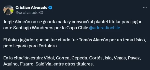 Así, lamenta la ausencia de un importante nombre. De acuerdo al periodista Cristian Alvarado de ADN Radio, Tomás Alarcón quedaría al margen de los citados del Cacique para el partido de este domingo.